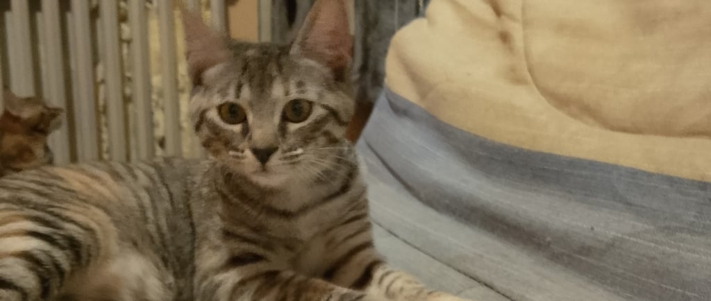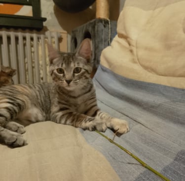Août a été recueillie avec son frère After. Août est une chatonne speed et très joueuse.