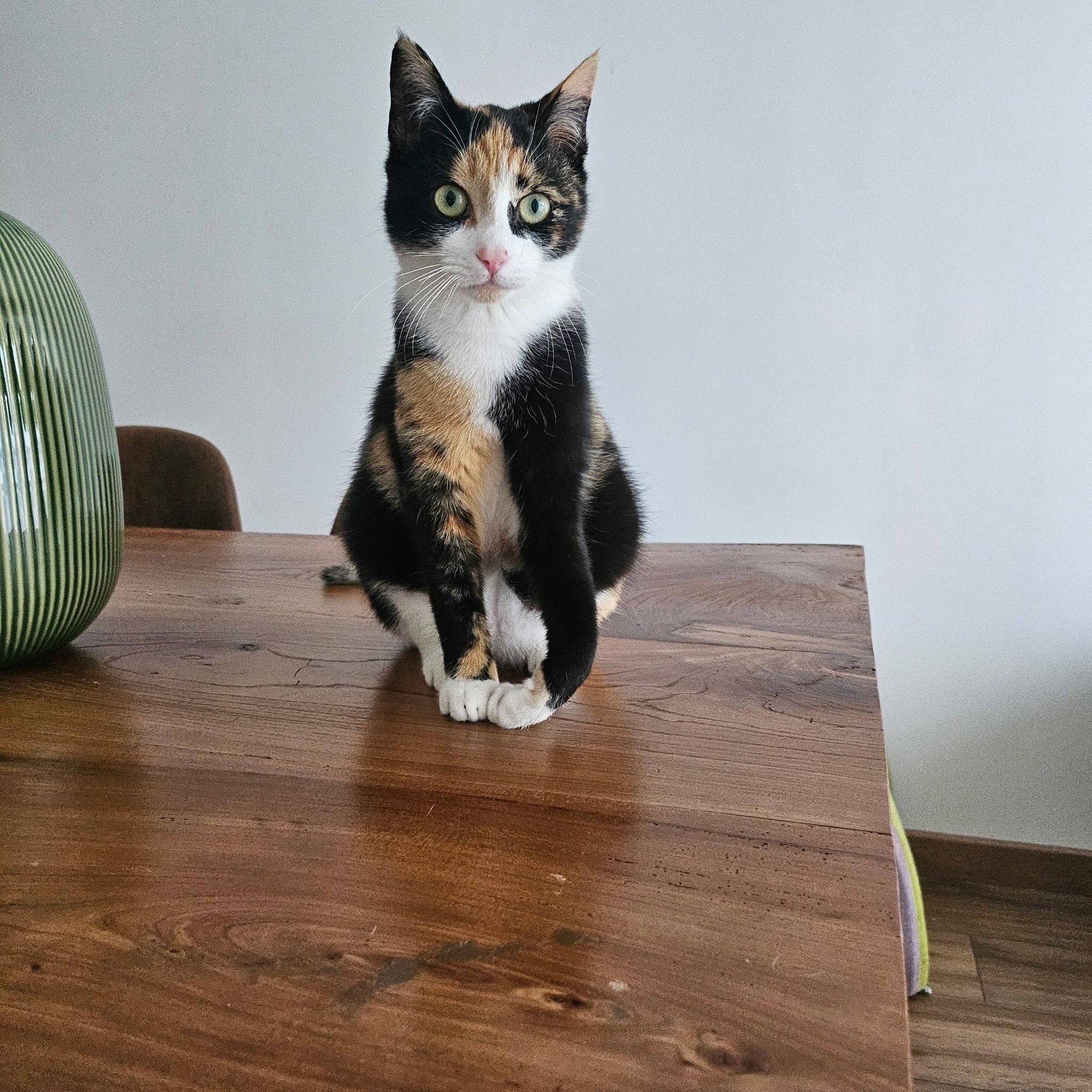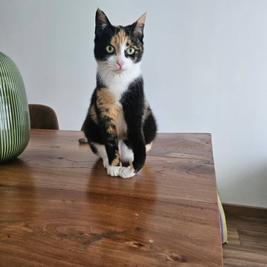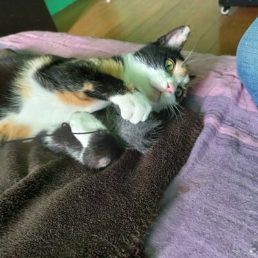 Cela n'empêche nullement Belle d'être totalement autonome. Elle aime se poster en hauteur pour surveiller son monde, sans la moindre difficulté. Elle est curieuse, propre, très joueuse, câline et en demande de contact humain. Elle ronronne facilement et se fait un plaisir d'accueillir ses humains comme il se doit (après une journée stressante au travail, que du bonheur!).
