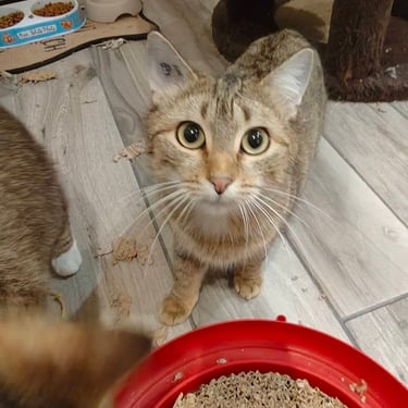 Sur mimétisme de sa soeur, elle vient désormais chercher les caresses. Bonna est d'un caractère très doux. Il lui faudra une famille patiente et douce également.