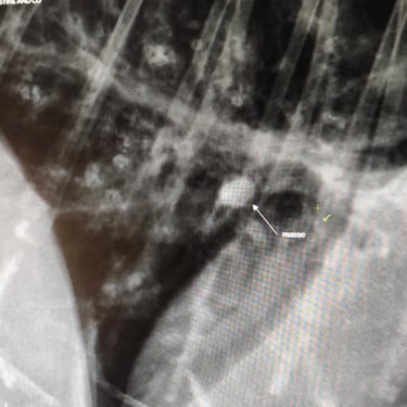 Agé de 14 ans, Pacha est resté seul, avec sa compagne Gaya, durant un mois, suite au décès de leur gardien. A sa prise en charge, des difficultés à respirer sont constatées . Les examens révèlent un épanchement, ainsi qu'une masse, sans certitude qu'il s'agisse de métastase. Un traitement et en cours et des examens complémentaires seront nécessaires.